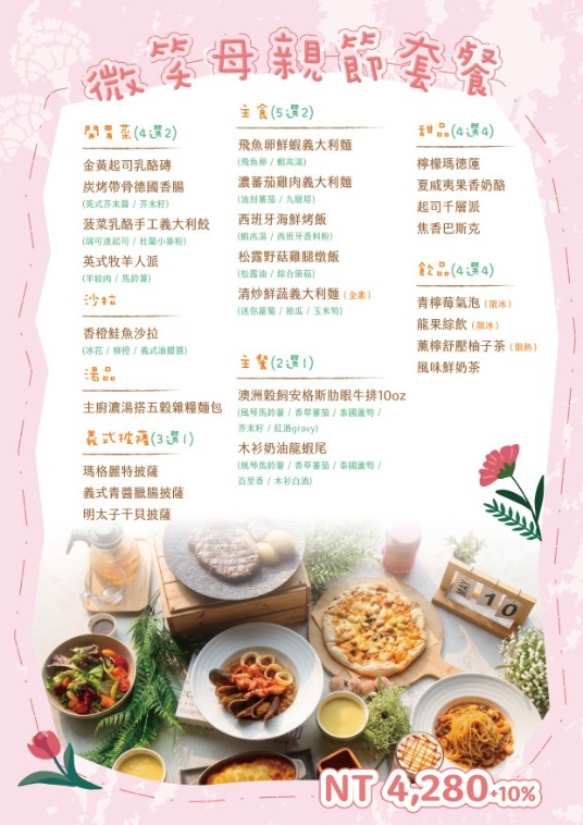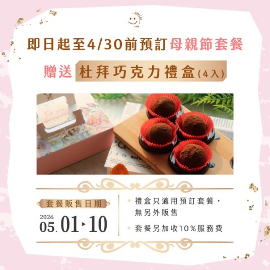 2026母親節套餐 母親節套餐開放預訂!4/30 前預訂加碼贈禮【杜拜巧克力禮盒】 套餐供應時間:5/1 - 5/10 4/30前預訂套餐,享有【杜拜巧克力禮盒】 即日起至4/30前預訂母親節套餐,即贈送杜拜巧克力禮盒(4入) 禮盒只是用預訂套餐,無另外販售 套餐另加收10%服務費 立即預約